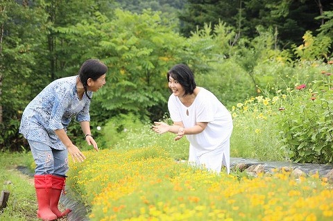 いよいよ明日7月30日(土)から「日本豊受自然農 洞爺ツアー2016」が開催いたします。本日29日(金)はツアーに先立ちましてとらこ先生と女優の杉田かおるさんが洞爺農場に一足先にご来園。杉田さんは豊受オーガニクス化粧品のイメージモデルとして、本日はとらこ先生と一緒にさまざまなハーブと共に撮影を行いました。朝方は洞爺周辺はどしゃ降りでしたがお二人が到着される頃にはすっかり雨もあがり晴れ間が広がるまでになりました。写真は洞爺湖中島をバックに、ハーブ園にて。杉田さんはエキネシア、とらこ先生はカレンデュラのお花を持って。